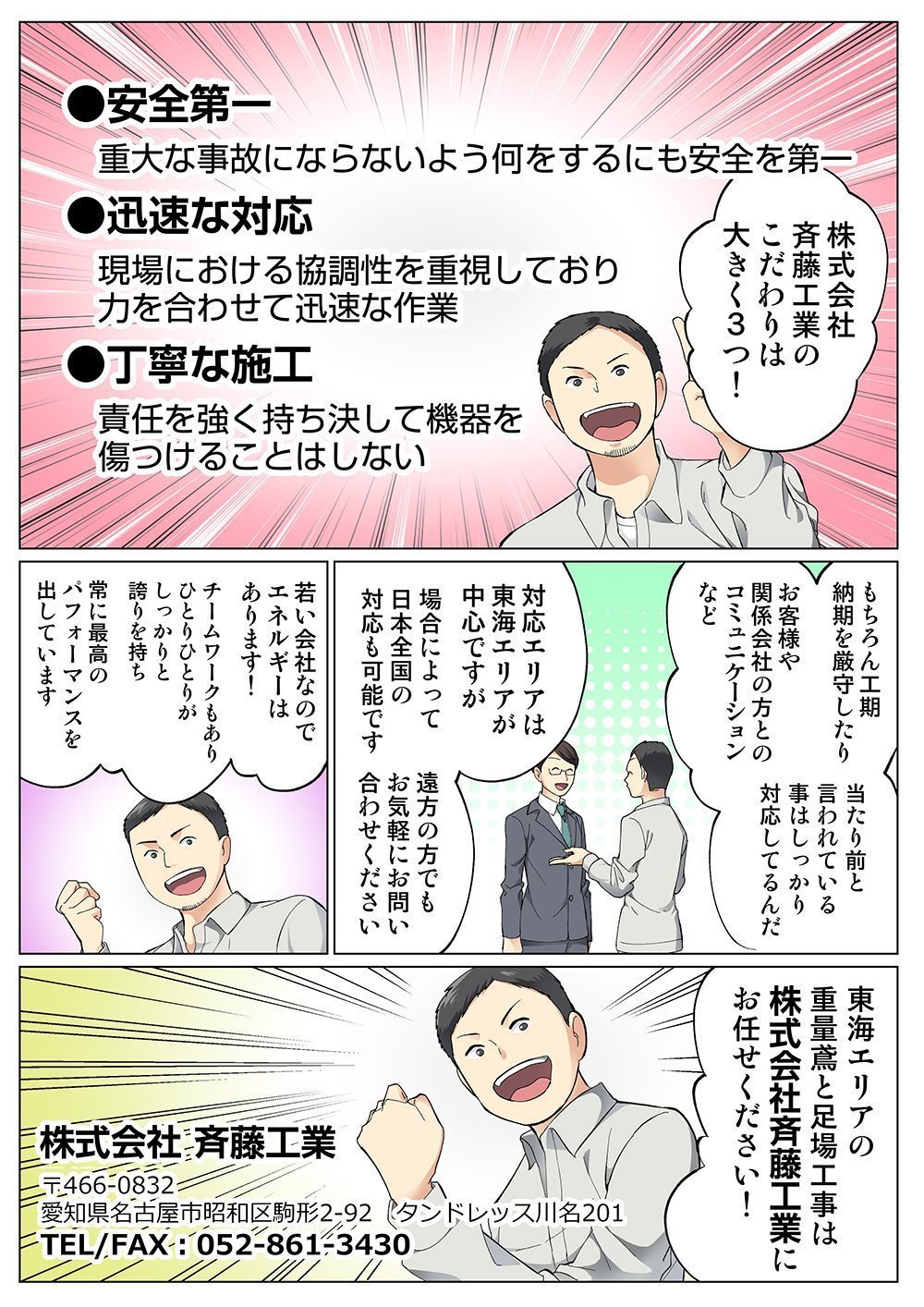 「職人」というとマナーがなく粗暴であるといったような、ネガティブなイメージを持たれる方が多いのではないでしょうか。株式会社斉藤工業ではそうしたことがないよう、指導を徹底。マナーや礼儀を守る職人が、揃っています。